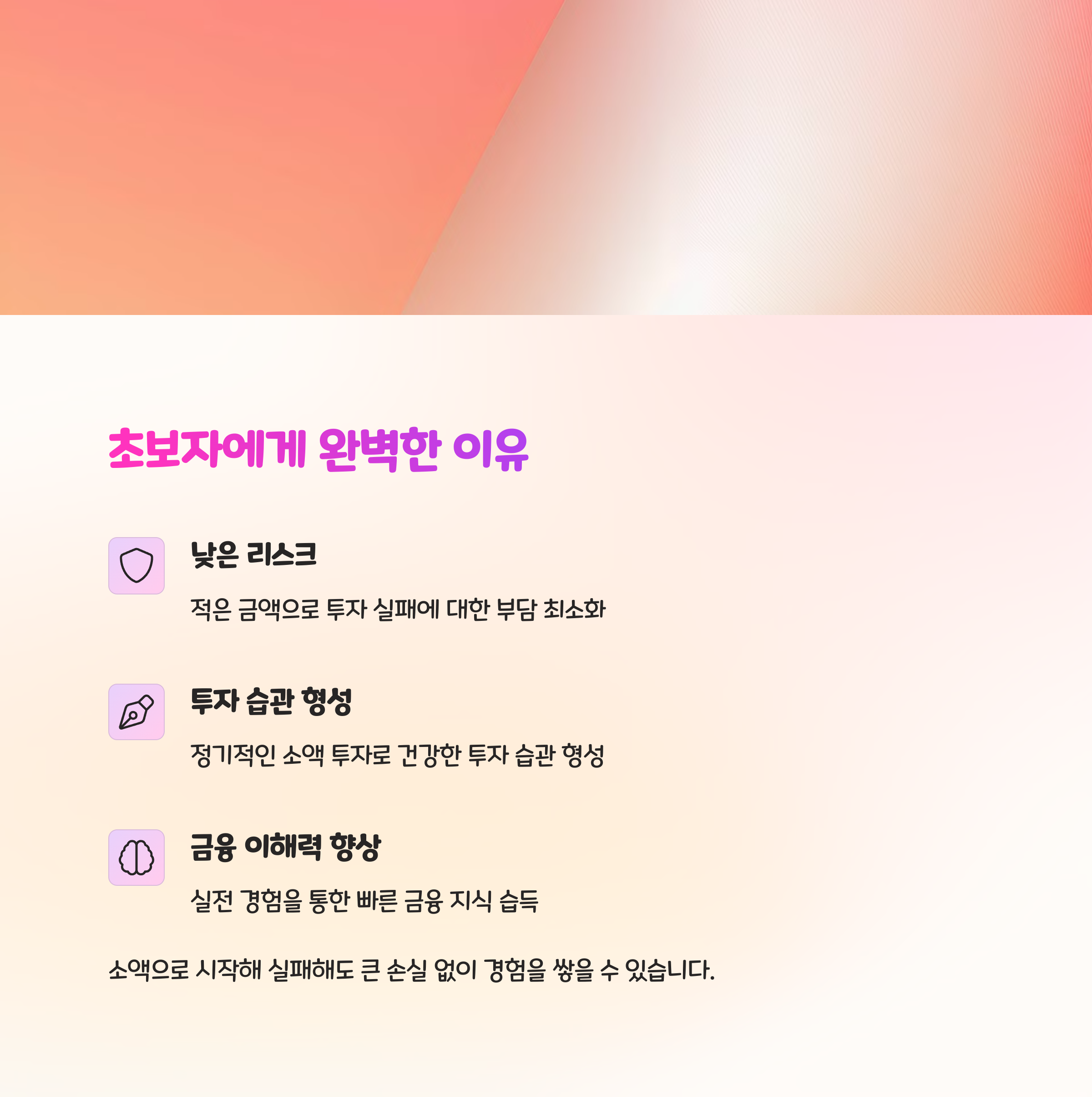 - ✅ 1만 원 이하 금액으로 첫 투자 경험해보기