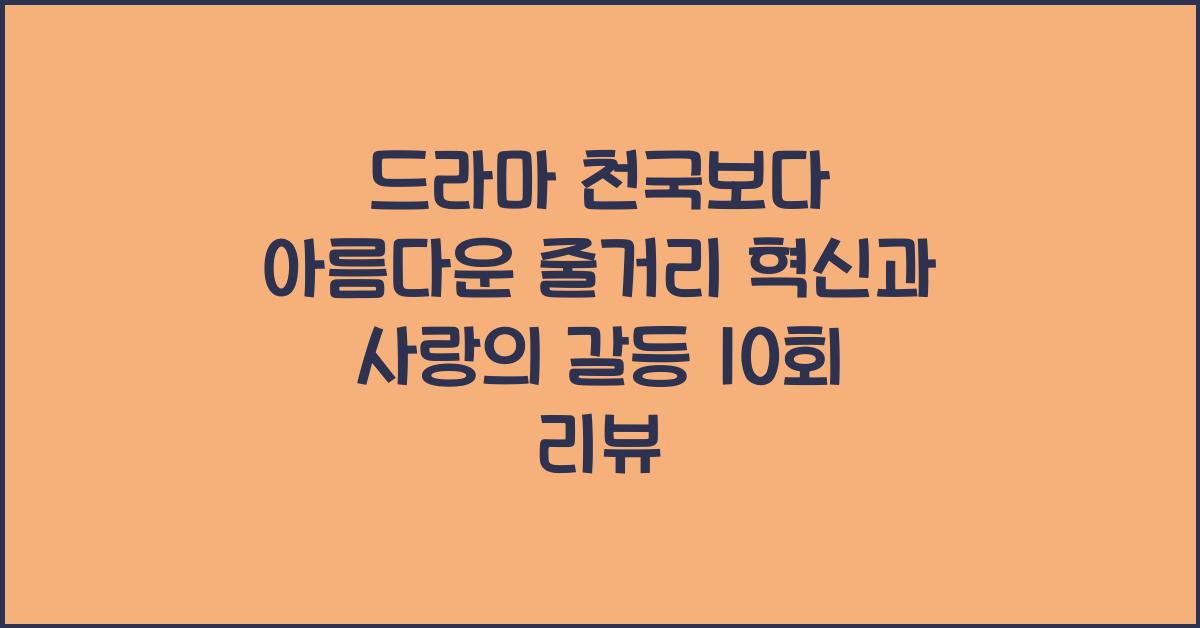 드라마 "천국보다 아름다운"은 사랑과 갈등의 복잡한 얽힘을 통해 감정의 깊이를 전달하며, 시청자들을 매료하는 줄거리로 많은 사랑을 받고 있습니다. 이번 리뷰에서는 10회의 하이라이트와 감정선을 중점적으로 살펴보겠습니다.