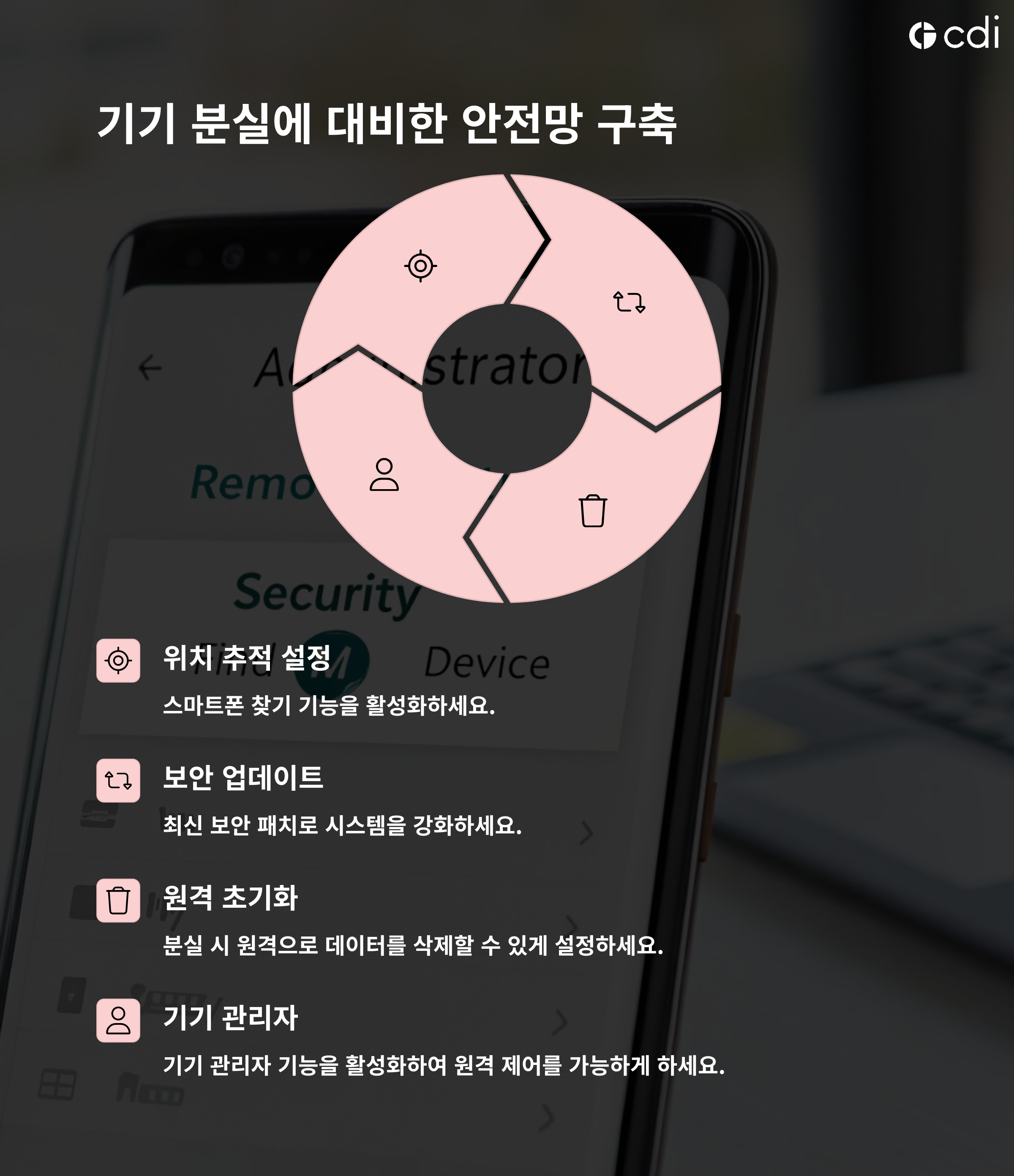 - 휴대폰 분실 시 원격으로 위치 추적, 데이터 삭제 등을 실행할 수 있습니다.